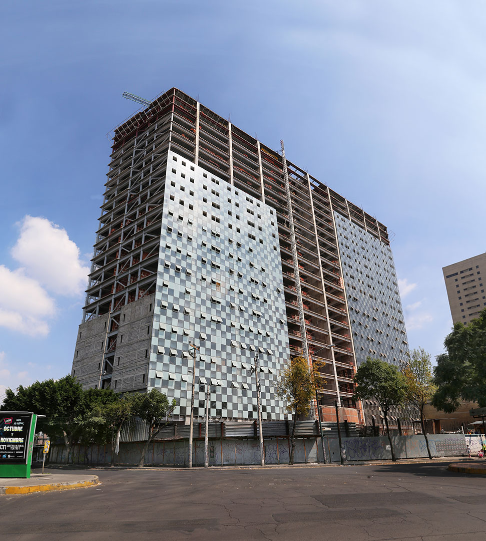 Complejo habitacional en cabeza de manzana con componente comercial en planta baja compuesto de 2 torres de 25 y 24 niveles respectivamente